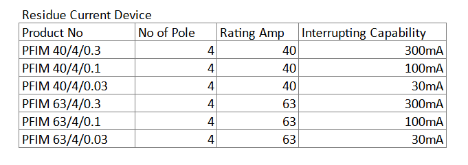 Product No | No of Pole | Rating Amp | Sensitivity |