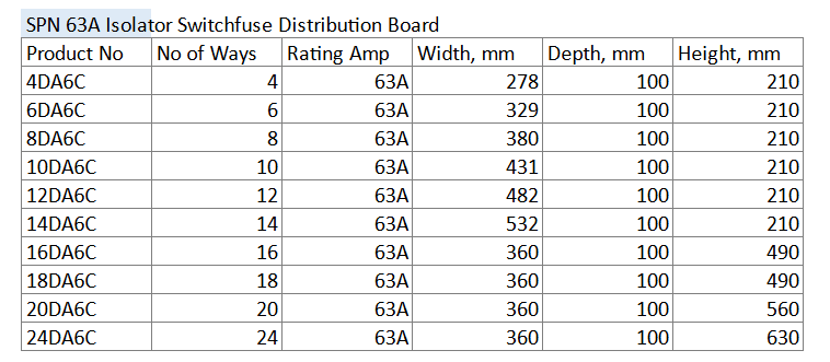 Product No | No of Ways | Rating Amp | Width, mm | Depth, mm | Height, mm |